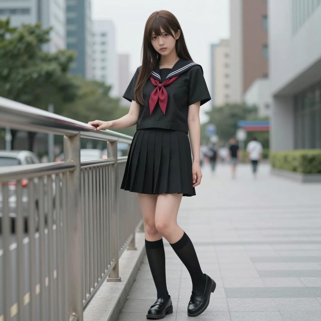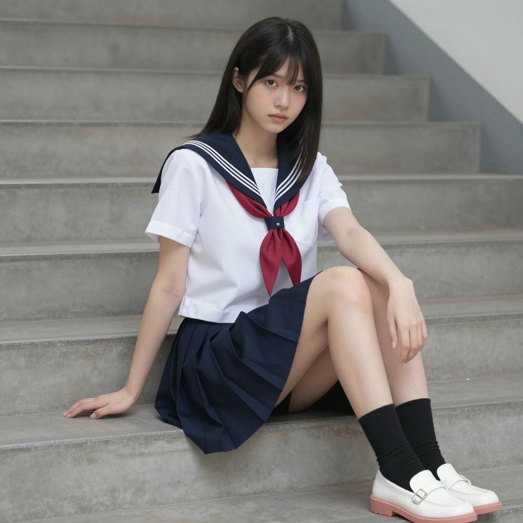 Young Asian woman with long black hair sitting on a stone bench. She wears a white short-sleeve blouse with a blue bow, a plaid skirt, black pantyhose, and black shoes. Arms crossed over her chest, legs extended forward. Background features modern glass buildings and railings. Facial expression is neutral. Bright daylight.