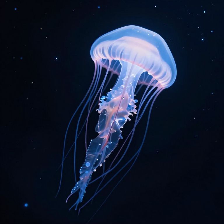 Photograph of a glowing blue and white jellyfish with translucent tentacles floating in a dark, star-speckled ocean background.