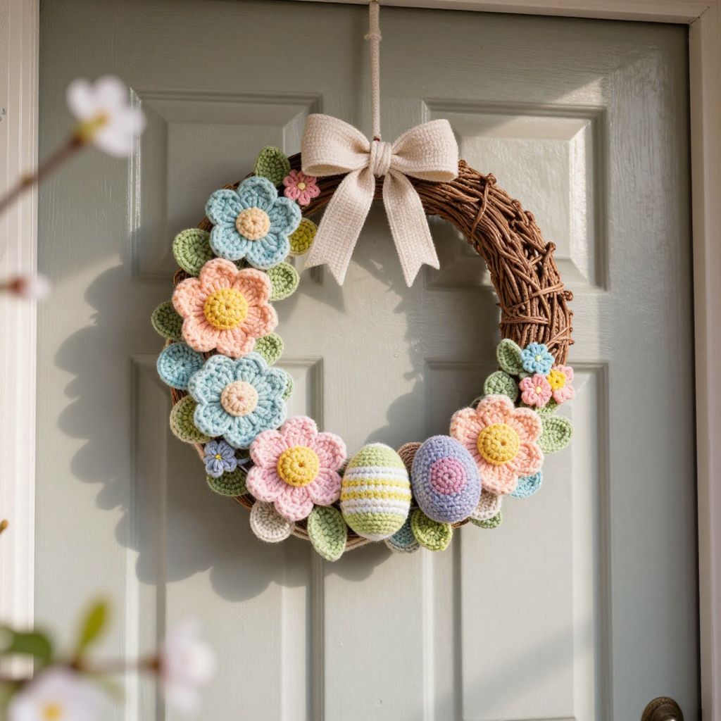 Elegant crochet Easter wreath featuring soft pastel yarn with carefully crafted flowers and eggs, hanging on a vintage door, surrounded by blooming spring flowers, warm sunlight casting gentle shadows, cozy and inviting setting.