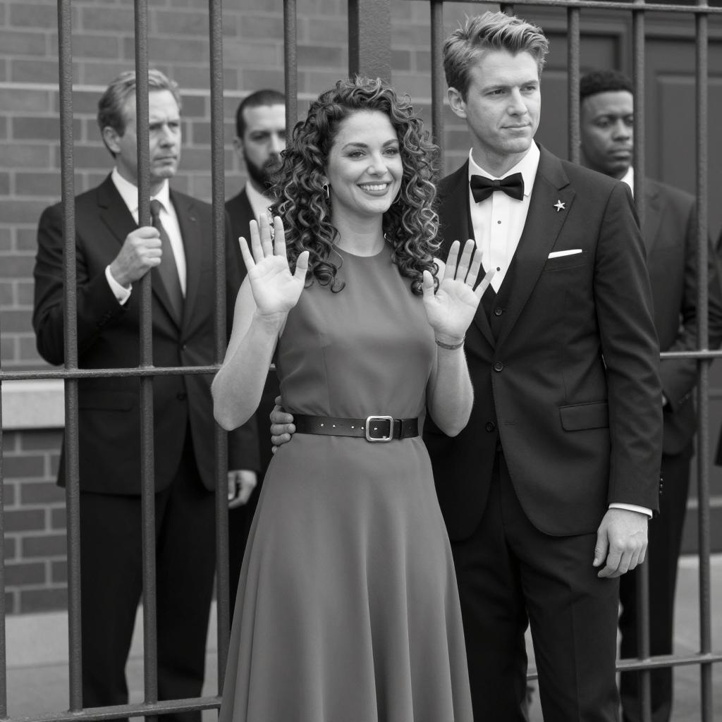 Black and white photograph of four people. Two men in dark sailor uniforms stand in the center, arms around two women. Woman on left with dark curly hair, light shirt; woman on right with blonde curls, striped dress, smiling. American flags in background. Men have short hair, neutral expressions. Woman on left looks sideways. Woman on right smiles at camera. All four people standing close together.