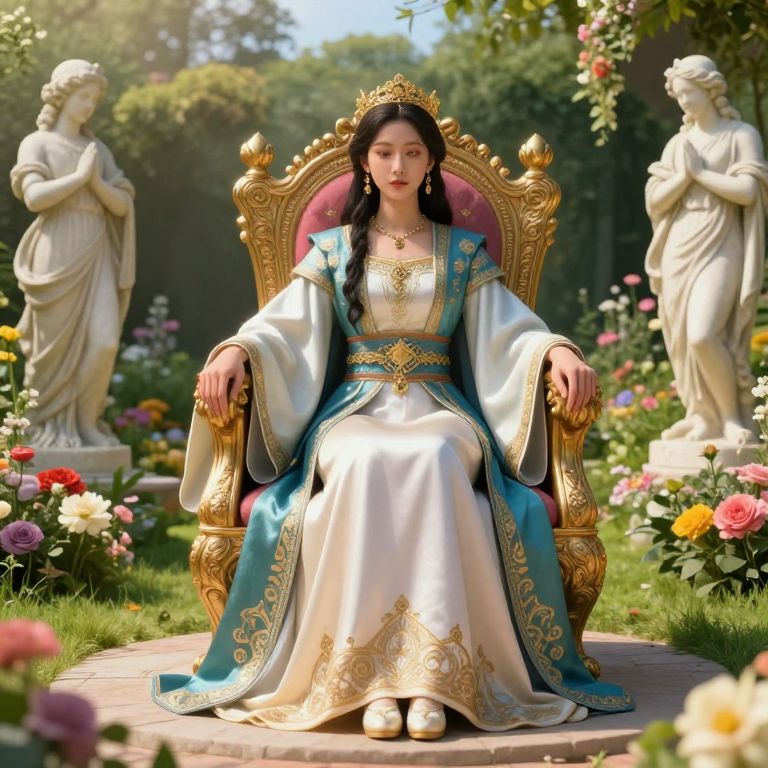 A serene regent seated on an ornate throne in a lush garden courtyard, surrounded by blooming flowers and ancient marble statues, soft afternoon light, flowing silk garments with elaborate patterns, fantasy art style with vibrant colors