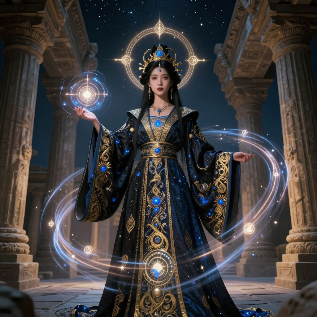 Digital painting of an Asian queen with long black hair, wearing an ornate gold and blue gown, seated on a regal throne surrounded by statues and