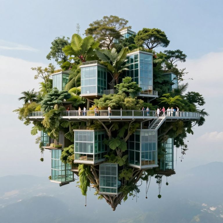 Photorealistic CGI image of a futuristic, floating treehouse complex. The structure comprises multiple glass-walled, rectangular buildings of varying sizes, integrated into a lush, green tree canopy. People in casual clothing are standing on a wide, glass-walled balcony on the top level. The treehouse is suspended in mid-air against a clear, blue sky, with a reflective body of water below. The trees, including palm and broadleaf species, surround the buildings, blending nature and architecture seamlessly. The overall design is modern and sustainable, emphasizing harmony with the environment.
