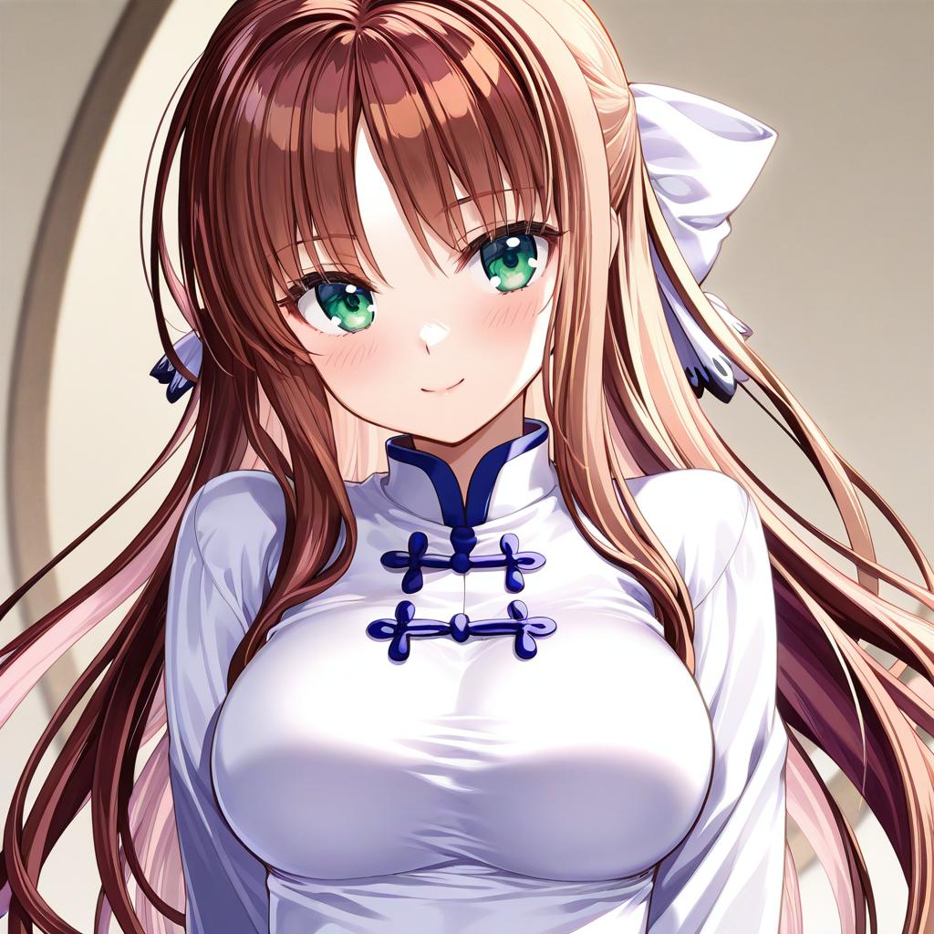Arima miyako, tsukihime, 1girl, green eyes, long hair, brown hair, hair bow, tangzhuang, by artist fujima takuya, illustrious