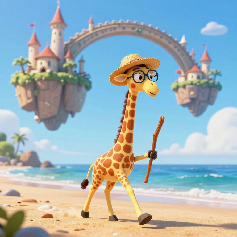 Photograph-style CGI image of a cartoon giraffe with large, round glasses and a tall, blue top hat with red and white stripes. The giraffe's face is expressive, with wide eyes and a slight smile. It has orange and brown patterned fur. The background features a whimsical, colorful cityscape with floating clock towers, greenery, and a bright blue sky. The clock towers have vibrant colors and ornate designs, adding a playful and fantastical element to the scene. The overall style is cheerful and imaginative, reminiscent of animated children's films.