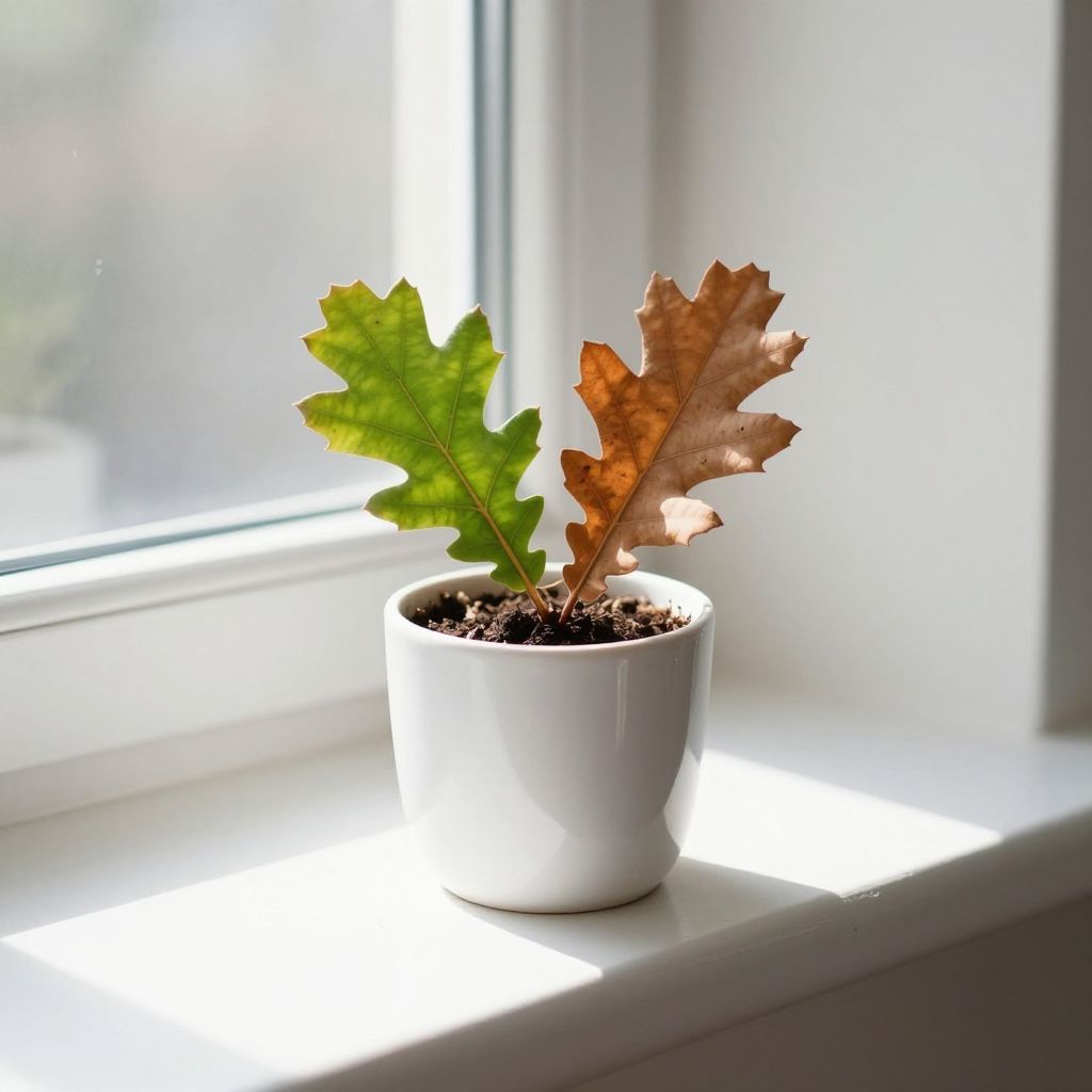 A white ceramic pot containing two oak leaves, one green and one brown, placed on a white windowsill with soft natural light casting shadows. The scene is minimalistic with a bright, sunlit background.