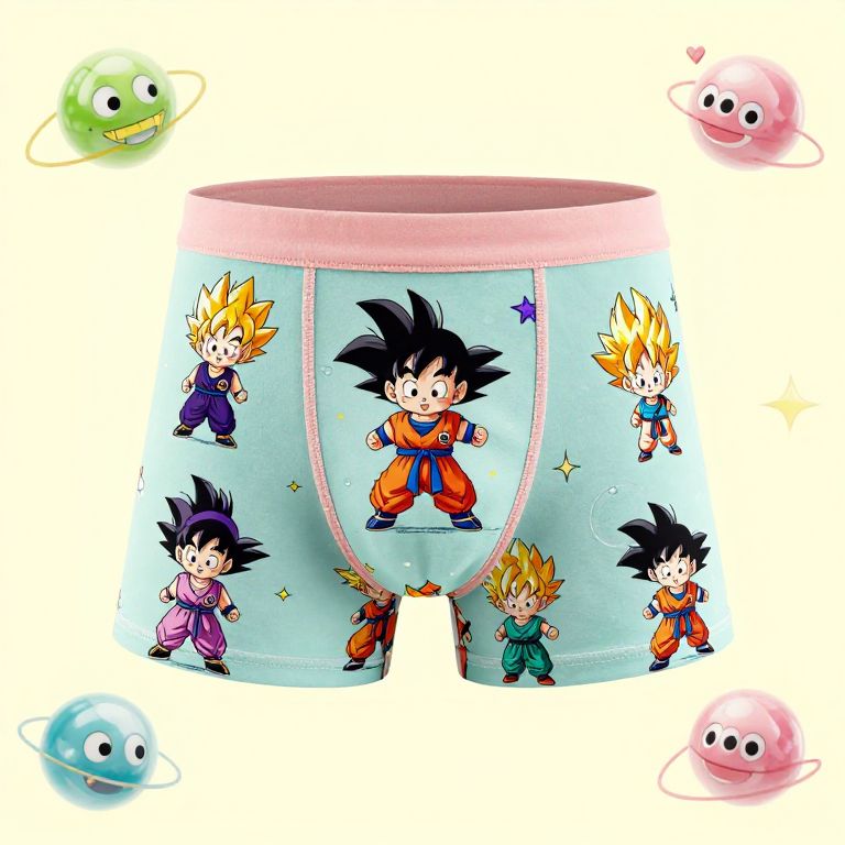 Whimsical Dragon Ball Z underwear featuring chibi characters, playful dragon balls orbiting, soft pastel colors, and a cheerful background inspired by the series’ lighthearted moments.