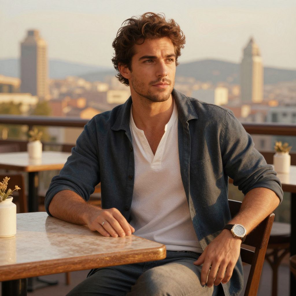 Handsome Spanish man sitting at a rustic cafe table, wearing a stylish casual outfit with a hint of classic elegance, warm golden hour light illuminating his chiseled features, Barcelona cityscape softly blurred in the background, painterly style