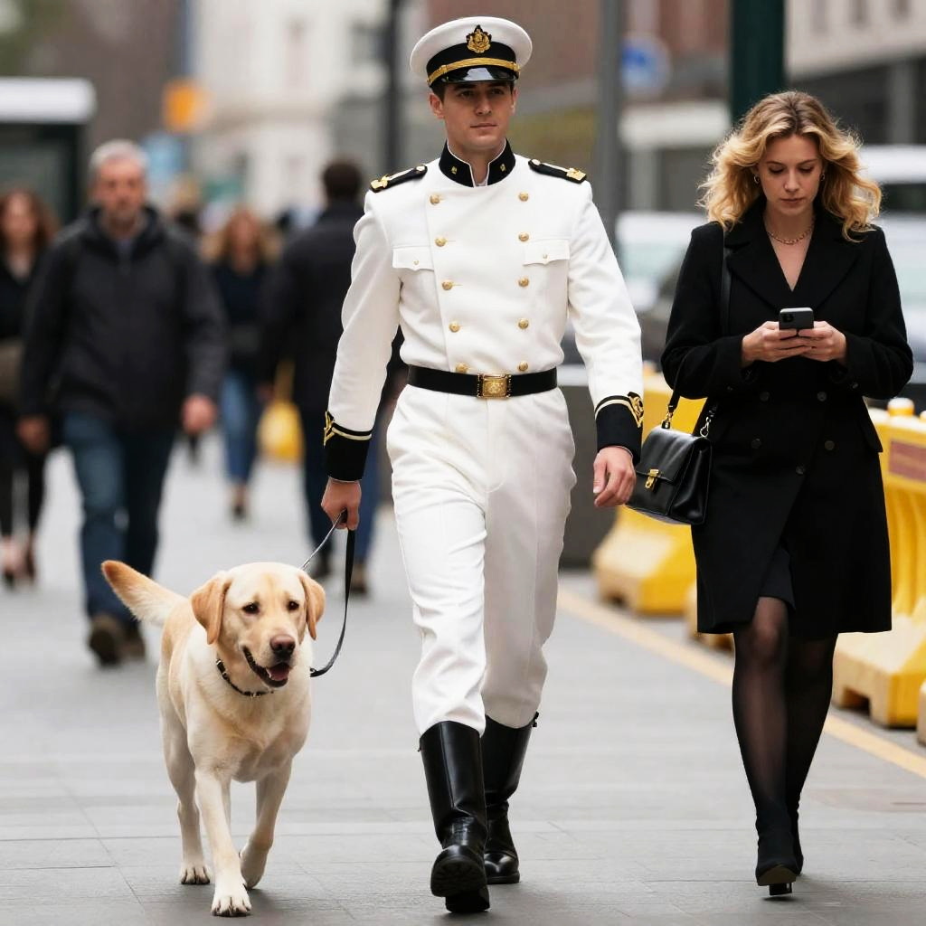 Photograph of a city street. A man in a white and black military-style outfit with a white shirt and black boots walks a yellow Labrador. A blonde woman in a black coat and dress holds a black handbag and looks at her phone. Background includes pedestrians, blurred buildings, and a yellow construction barrier.