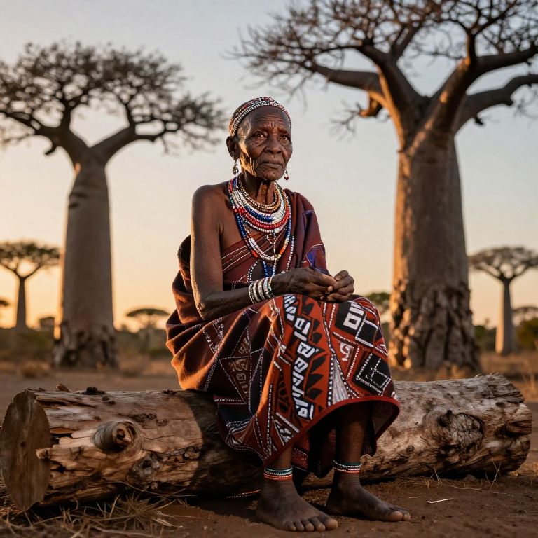 Envision a smartphone portrait capturing an African tribal elder's enigmatic presence; deep lines carve her weathered face, and piercing brown eyes reveal a lifetime of wisdom. The warm golden sunset illuminates as she sits atop a sun-bleached log in an ancient baobab forest, its gnarled branches forming an organic canopy. From a low angle, this captivating portrait reveals intricate beaded headwear and patterned cloth draped over one shoulder; bare feet rest on the earthy ground. This hyperrealistic image evokes reverence for her cultural heritage and an emotional connection to untold stories woven into her very being.