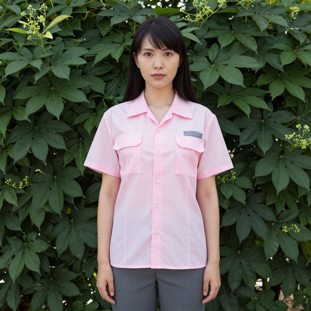 Photograph of a young Asian woman with straight black hair and bangs, standing in front of a dense green leafy background. She wears a short-sleeved, light pink button-up shirt with a small green logo on the left chest, and gray pants. Her expression is neutral, with a slight hint of seriousness. The lighting is natural, highlighting her fair skin and the texture of the leaves behind her. The image is sharply focused, capturing the details of her attire and the lush foliage.