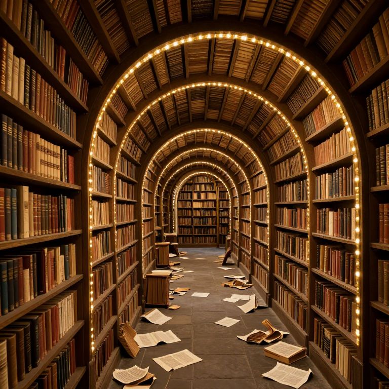 Books form an intricate spiral archway within a labyrinthine library, their golden spines creating concentric circles that recede into the distance, while scattered pages and broken bindings lie strewn across the stone floor, hinting at the forgotten stories they once held.