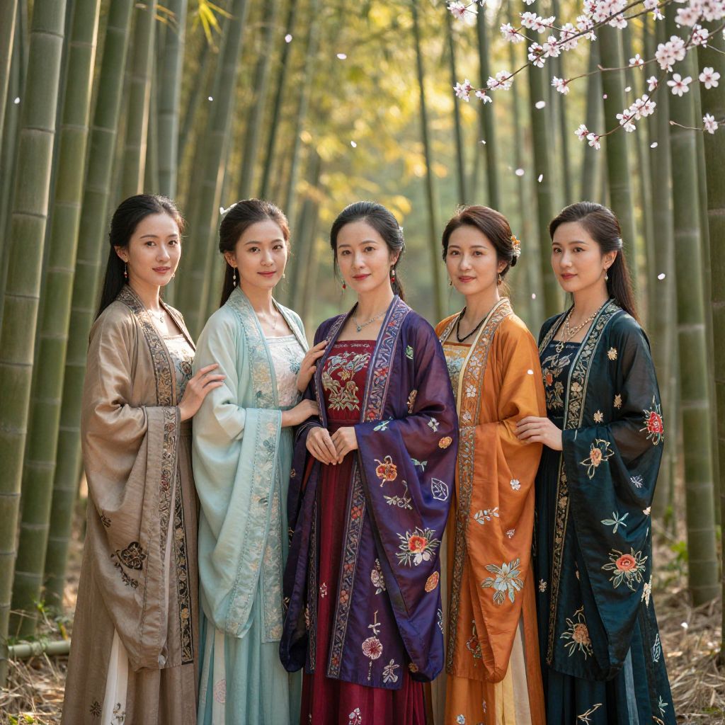 Asiatiche women in traditional vibrant silk dresses, intricate floral embroidery, standing in a serene bamboo forest with soft sunlight filtering through, delicate cherry blossoms floating around, evoking peace and timeless beauty, detailed textures and natural harmony.