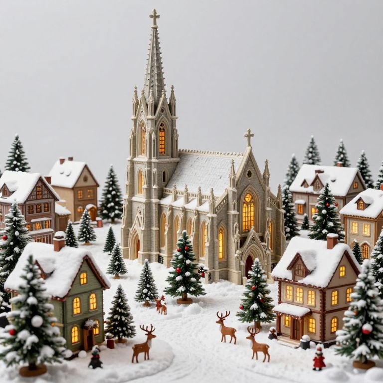 The image depicts a charming Christmas village scene, meticulously crafted with a fantasy festive theme. The central focus is a grand, Gothic-style church with intricate stonework and a towering spire, its windows glowing warmly. Surrounding the church are various houses, each uniquely designed with detailed facades and illuminated windows, creating a cozy, inviting atmosphere. Snow blankets the roofs and ground, adding to the wintry ambiance. Christmas trees, adorned with festive decorations, are scattered throughout the scene, their greenery contrasting beautifully with the white snow. Miniature reindeer and other holiday figures add a touch of whimsy, enhancing the magical quality of the village. The overall composition is harmonious, with elements arranged in a balanced manner, creating a sense of depth and perspective. The interplay of colors, textures, and shapes contributes to the enchanting and nostalgic feel of the Christmas village, evoking a sense of warmth and wonder.