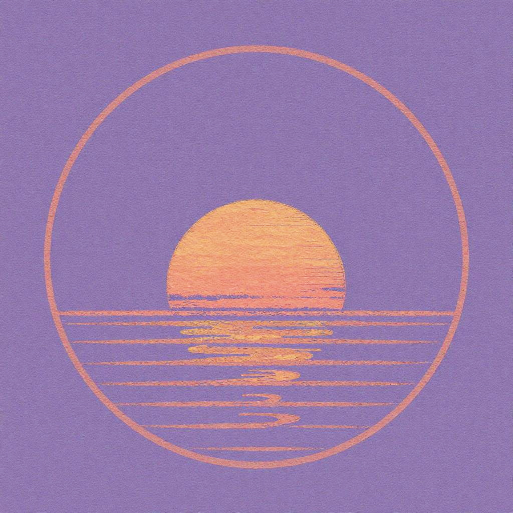 Hand-drawn retro sunset art, lavender dusk palette, serene awe, circular design, scratchboard engraving