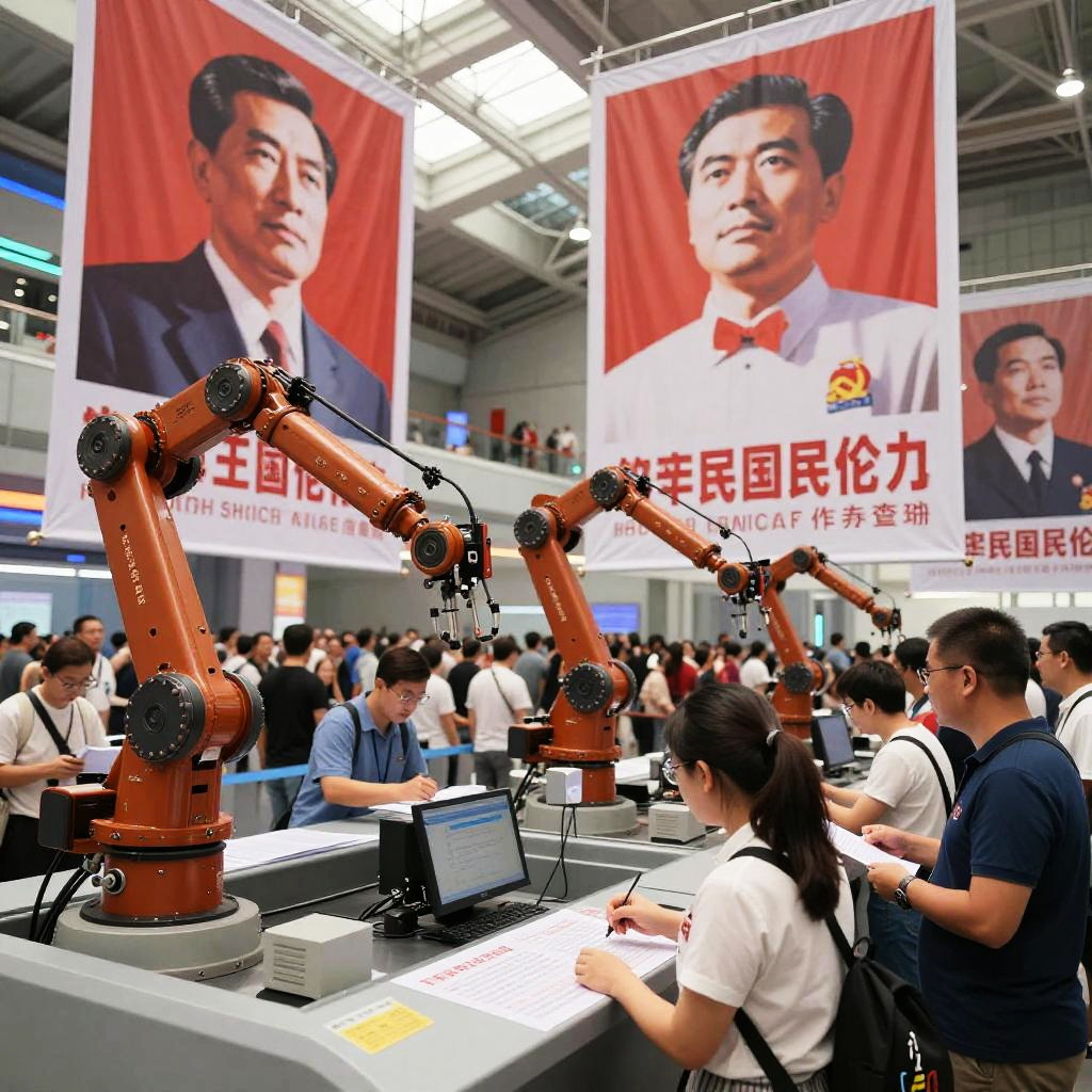 Futuristic propaganda generator station, robotic arms printing massive propaganda banners, crowd of diverse people receiving information, dynamic composition with bright colors and high contrast, blending traditional socialist realism with sci-fi elements
