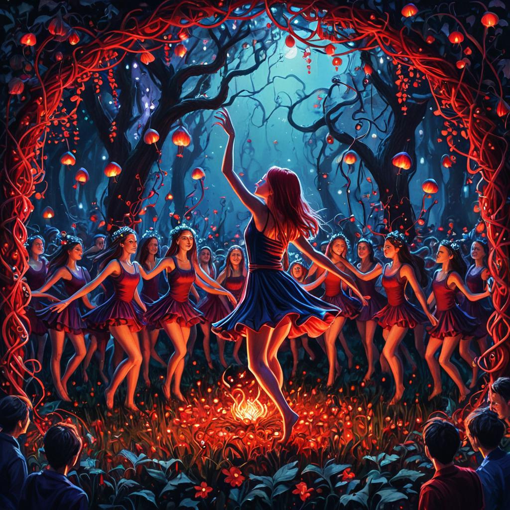 Digital oil painting depicting a group of female sprites dancing in a glowing crimson twilight garden surrounded by twisting vines and luminous red mushrooms. The central figure, a glowing sprite in a short dress, dances mid-air as a crowd of similarly dressed dancers and shadowy onlookers gather beneath a glowing full moon. The scene is filled with ethereal blue and red lighting, creating a mystical and enchanted forest atmosphere.
