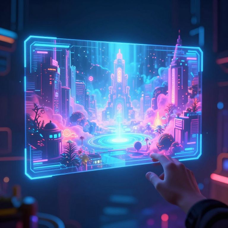 Neon-lit digital cityscape projected on a screen, illuminated in vibrant blues, pinks, and purples, with a hand pointing at it