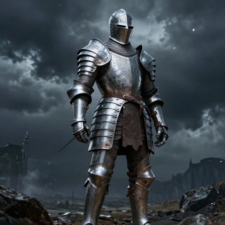A digital artwork depicts a formidable medieval knight in full, polished silver armor standing on a rocky, desolate landscape. The knight's helmet, with a reflective visor, obscures their face. The armor is intricately detailed with rivets and a chainmail underlayer. The background features a dark, stormy sky with dramatic clouds and distant, barely visible ruined castle structures. The knight holds a sword in their right hand, with the hilt visible. The overall color palette is dark and moody, emphasizing the somber, battle-ready atmosphere. The texture of the armor gleams under the dim light, contrasting with the rough, shadowy terrain.
