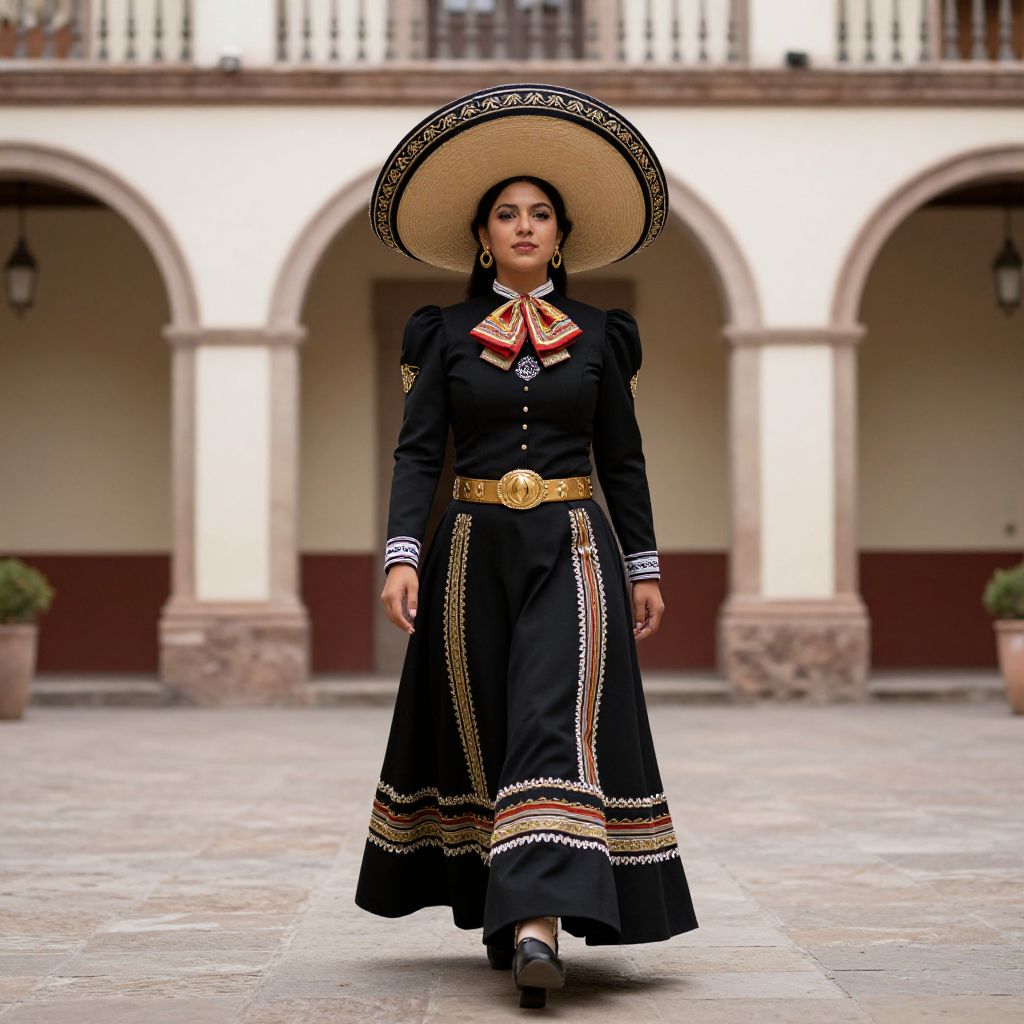 Matador Costume Girl, woman in a mexican costume walking in a courtyard with a large hat