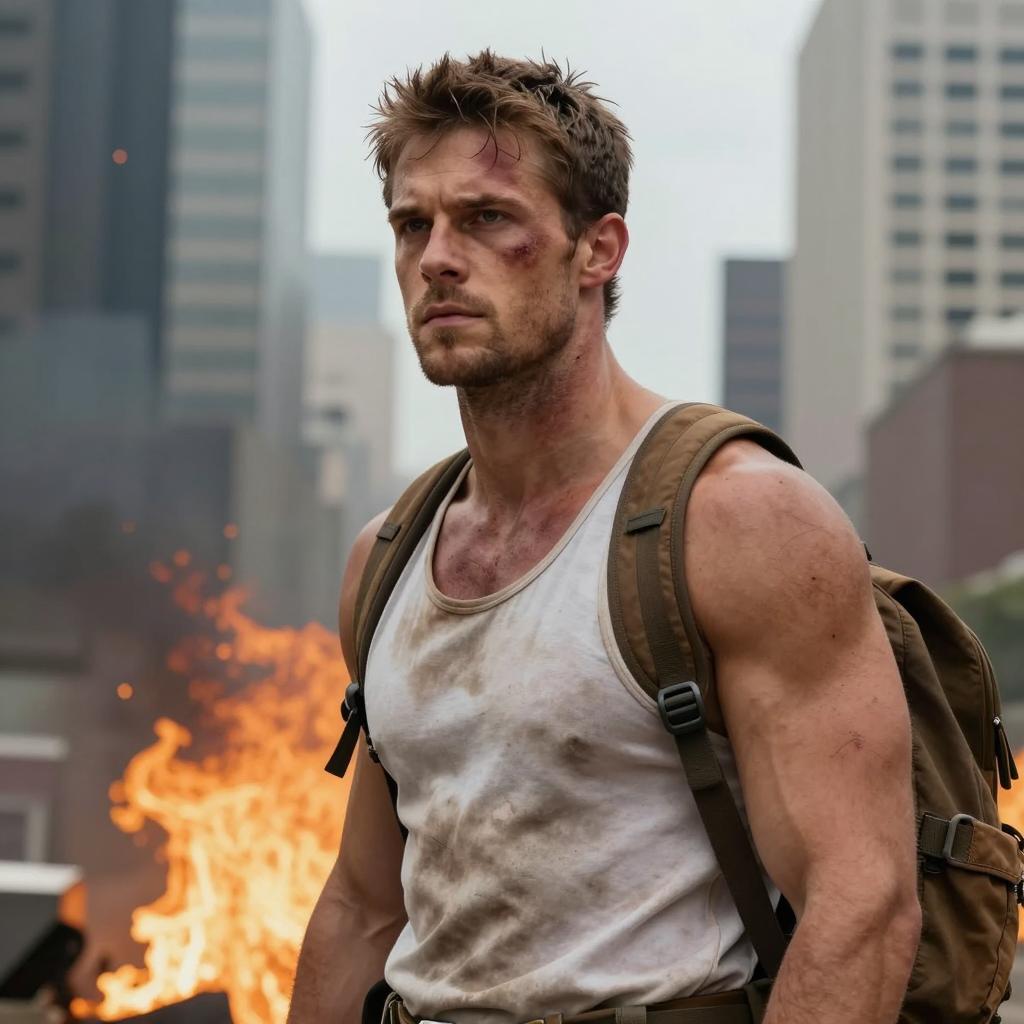 Man with messy brown hair, wearing black leather jacket and eyepatch, holding a small black device, grinning with teeth showing. Background is blurred with warm orange bokeh lights. His blue eye is visible. Close-up, frontal view.