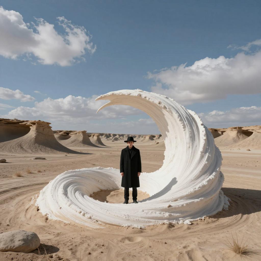 A surreal image of a man in a black coat and hat standing at the edge of a large white spiral vortex in a barren desert-like environment with unusual swirling rock formations. The sky is clear with scattered clouds, creating a dramatic and otherworldly atmosphere.