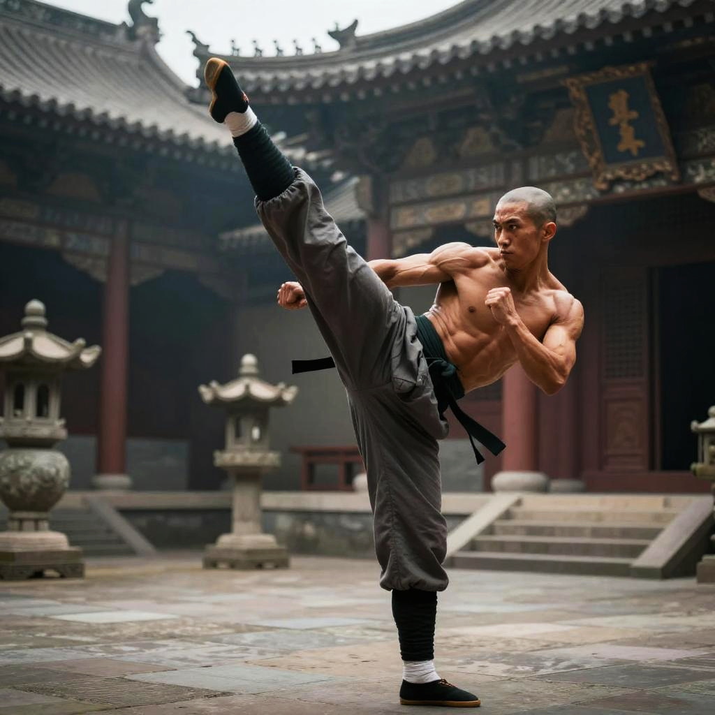 Skilled martial artist performing a dynamic high kick in an ancient temple courtyard, detailed muscles and fabric movement, dramatic lighting, misty background, intense atmosphere, action-packed scene