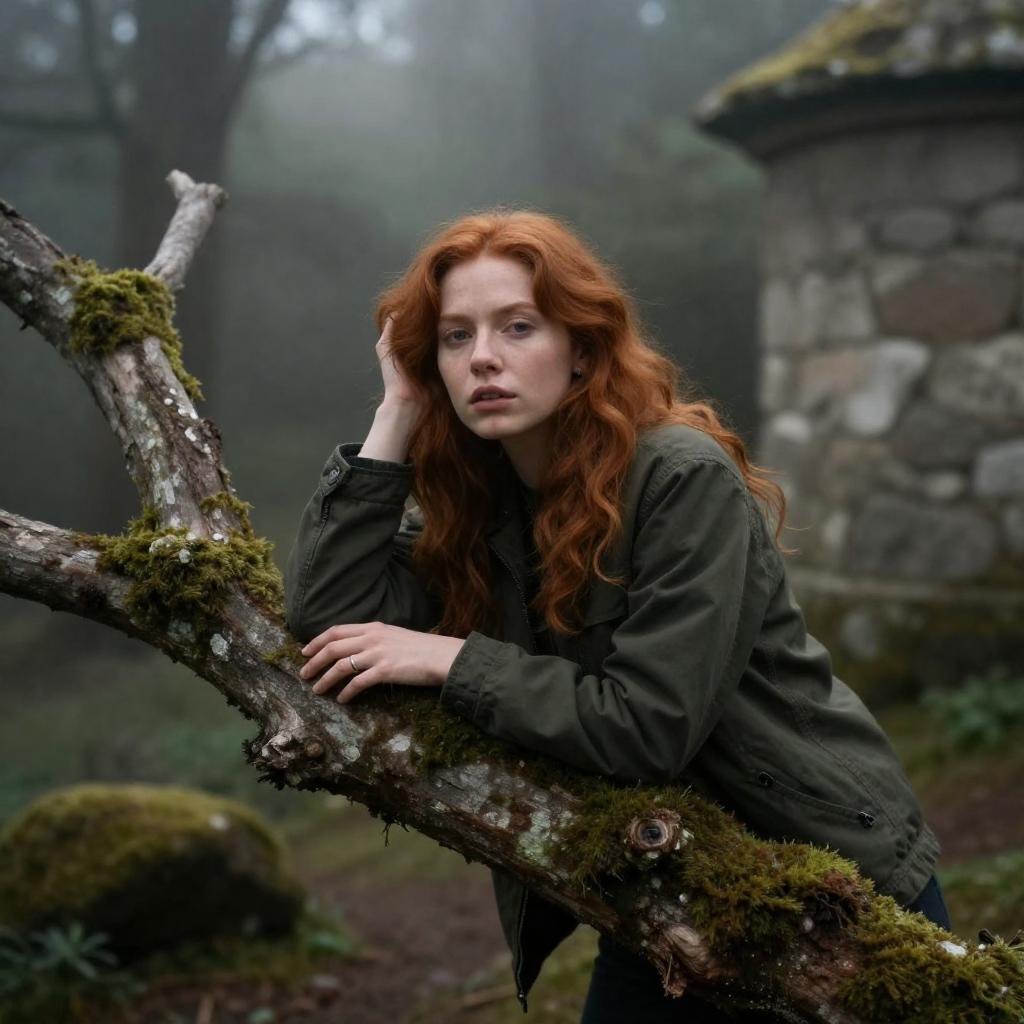 Photograph of a red-haired woman with wavy hair, wearing a dark green jacket, leaning on a moss-covered, twisted tree branch in a dense, misty forest. She gazes intently at the camera, with a stone structure partially visible in the background. The lighting is soft, creating a mysterious, ethereal atmosphere.