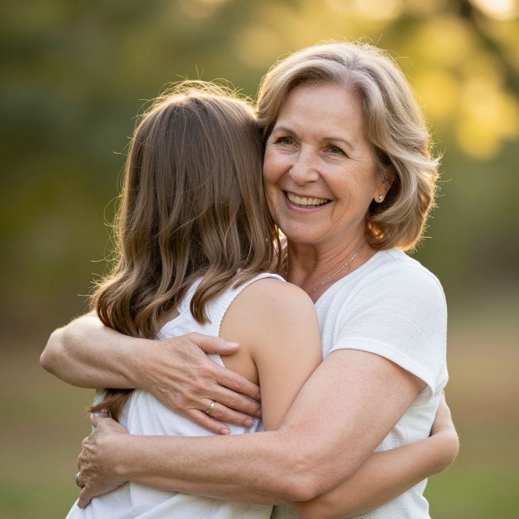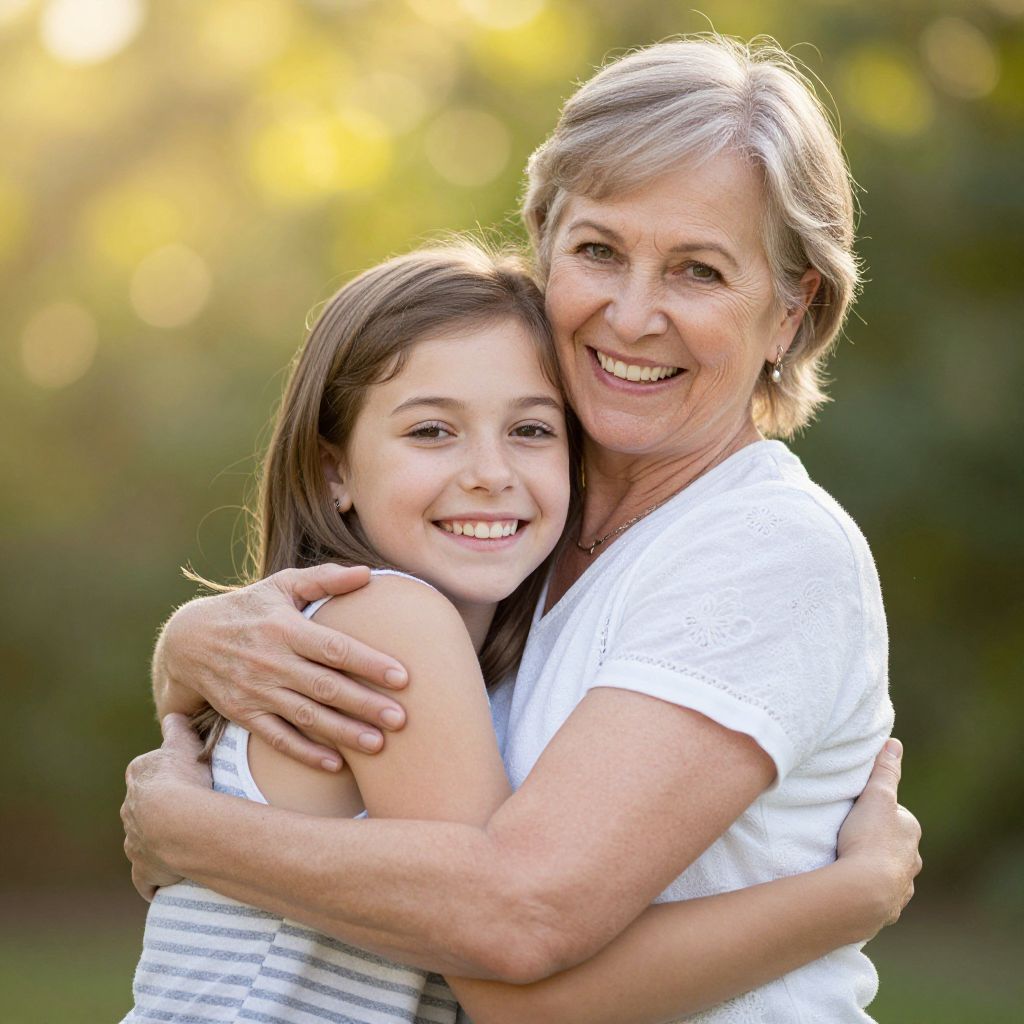 Senior woman warmly embraces her granddaughter in a tender hug, both smiling brightly against a softly blurred outdoor backdrop of green foliage and golden sunlight.