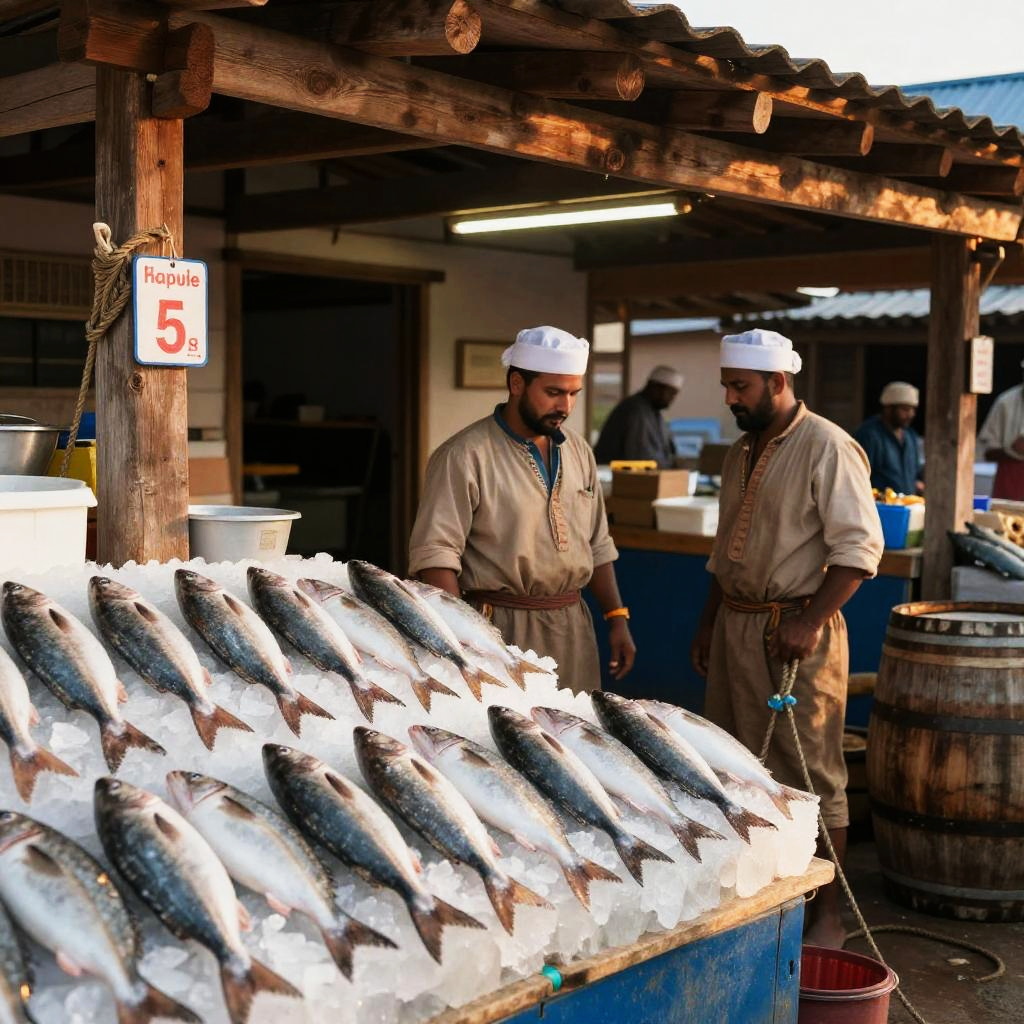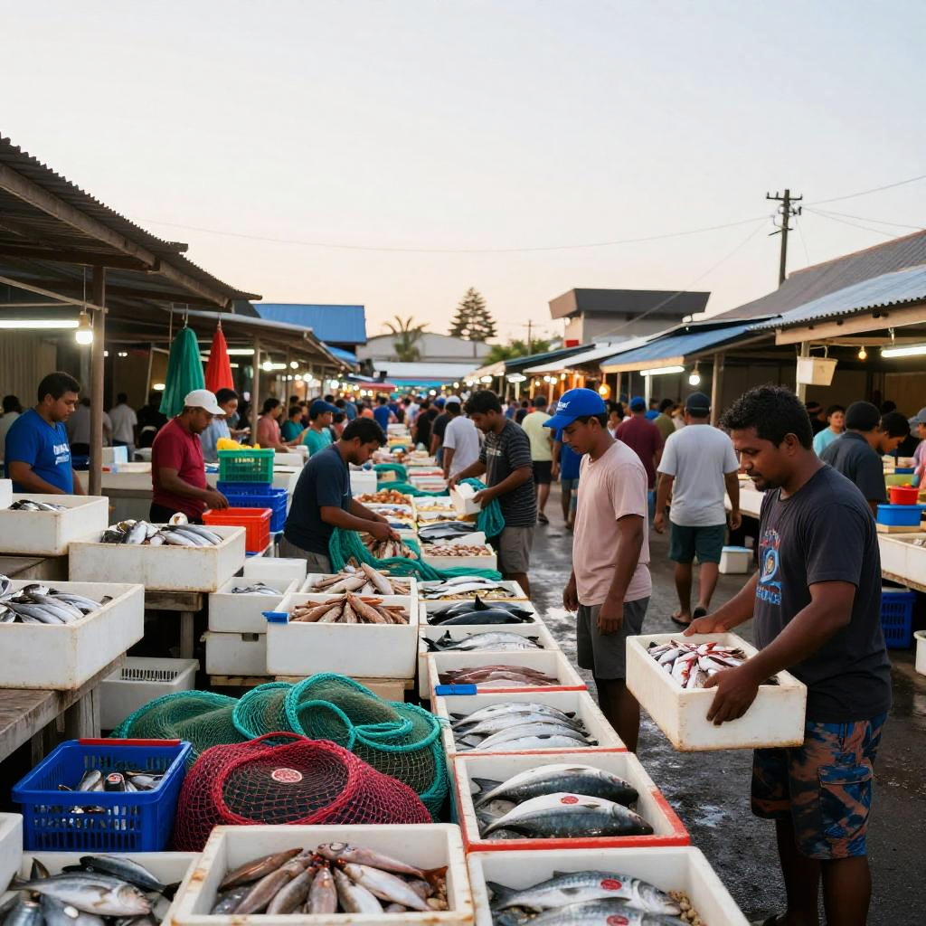 Neptune fish market bustling at dawn, vibrant stalls with fresh seafood, colorful nets and fishermen unloading crates, lively crowd under soft morning light, hyper-realistic style