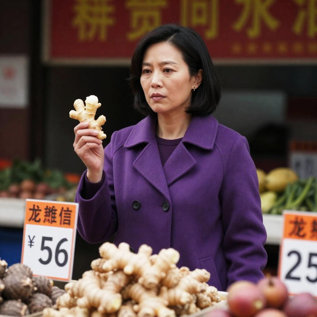 Photograph of three people in a market. Middle woman with short black hair, maroon dress, and patterned red purse, looks forward. Woman to left with long black hair, gray jacket, looks down. Man to right, black jacket, neutral expression. Market stall with fruits, vegetables, and festive decorations in background.
