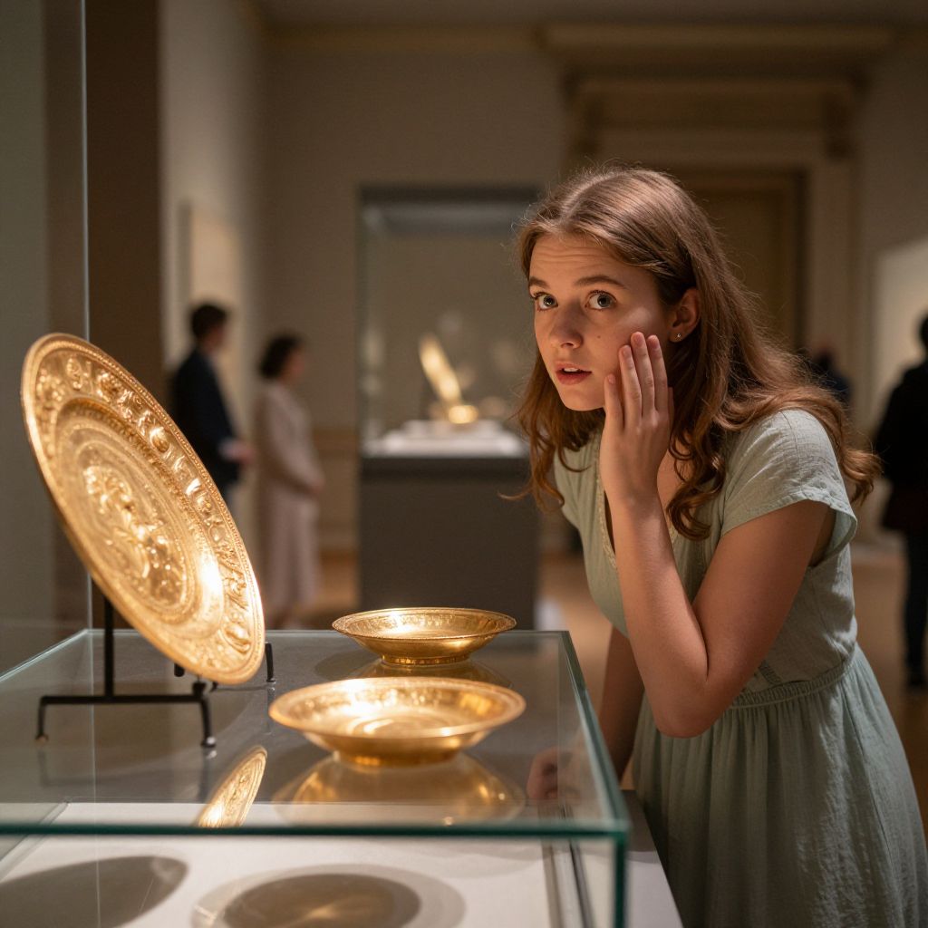A realistic portrait of a museum exhibit featuring golden plates displayed on a glass pedestal, with a young woman in a light green dress, her face curious and attentive, looking directly at the plates in a high-end museum with softly lit ambient lighting and historical backgrounds.