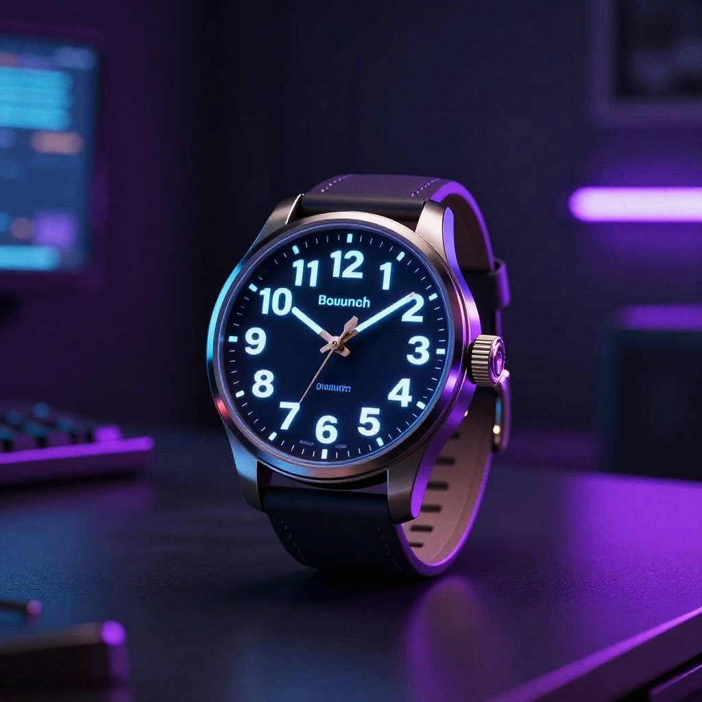 Wecker with futuristic design on a glossy surface, digital holographic display projecting the time in mid-air, neon blue and purple light accents, dark room background with cyberpunk aesthetic, high detail, vibrant colors