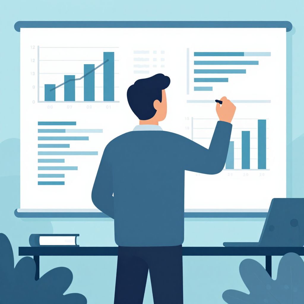 Post-Production business man standing in front of charts and statistics, bar charts, 2d flat, illustration style , half body,