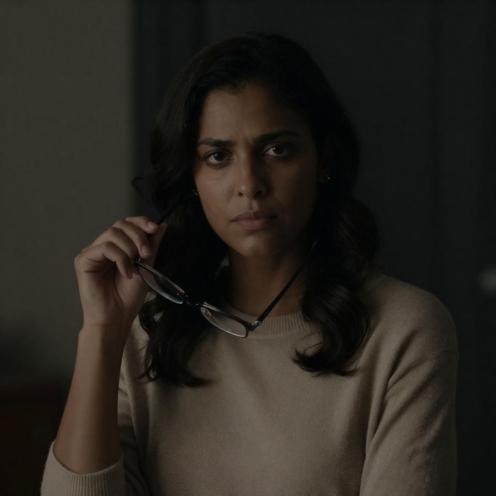 A dimly lit photograph of a serious-looking woman with medium brown skin and wavy dark hair, wearing a beige sweater. She holds a pair of glasses in her right hand, positioned near her ear. The background is dark and indistinct, with a hint of vertical lines suggesting a wall or door. The image has a moody, cinematic feel.