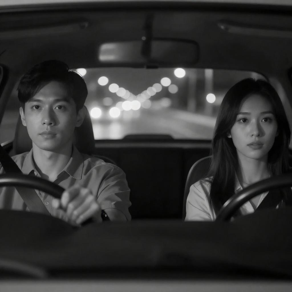 Black-and-white photograph of a dramatic scene. A young woman with straight, dark hair and a white blouse stands in the foreground, looking worried. A tall man in a dark suit stands behind her, illuminated by a spotlight. Another person's back is partially visible in the foreground. The background includes a desk with a lamp.