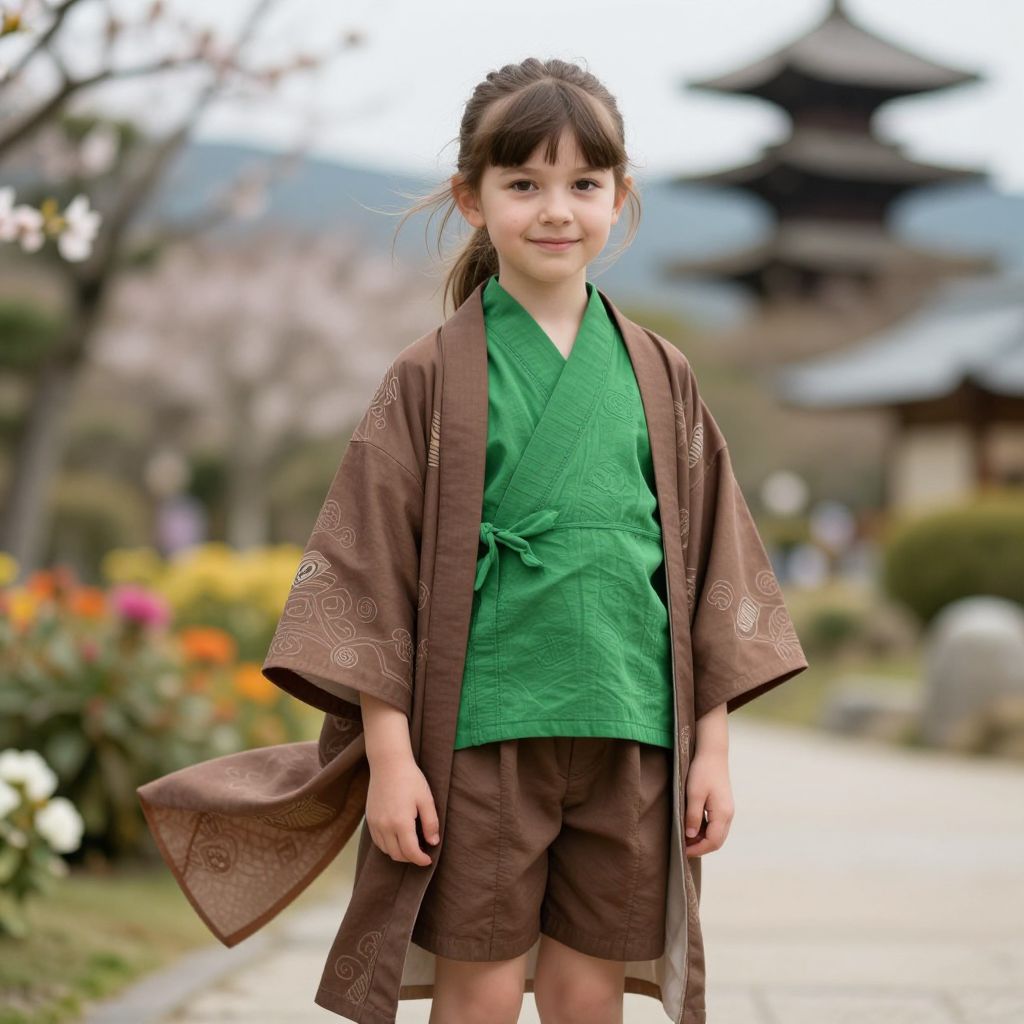 A young girl with soft brown hair styled in a neat ponytail stands confidently in a serene outdoor setting. She wears a traditional brown kimono with intricate patterns, paired with a vibrant green cotton shirt and comfortable brown shorts. The kimono flows slightly in the breeze, adding a touch of elegance and cultural charm. Her expression is calm and friendly, with a warm smile, and the background features a gently shaded garden with blooming flowers and a distant pagoda, creating a peaceful and authentic atmosphere.