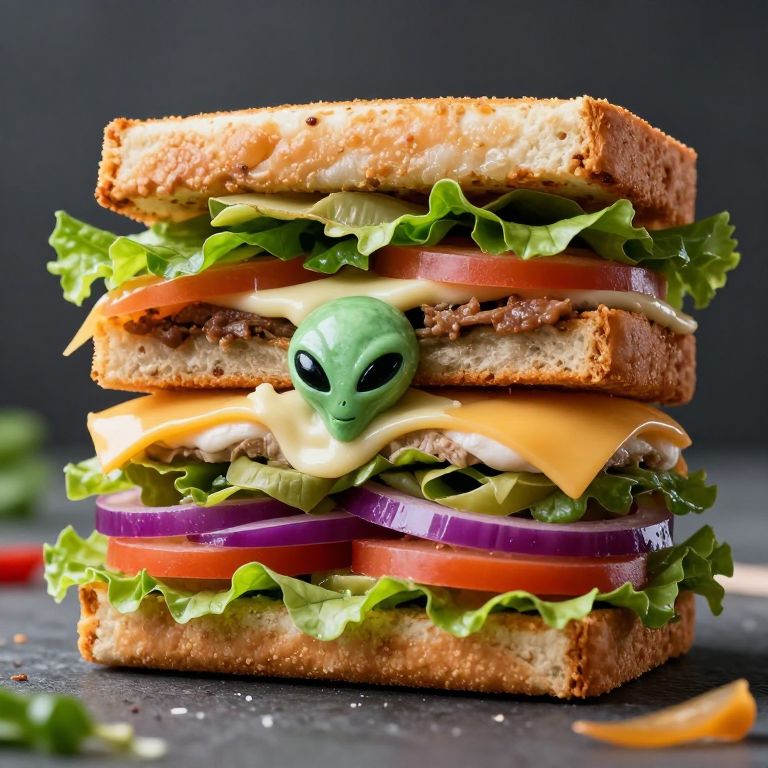 Close-up of a multi-layered sandwich with toasted bread, lettuce, tomato, cheese, onion, and meat, featuring a small green alien figurine embedded between cheese layers. The sandwich is vibrant, colorful, and shot with cinematic lighting on a dark background.