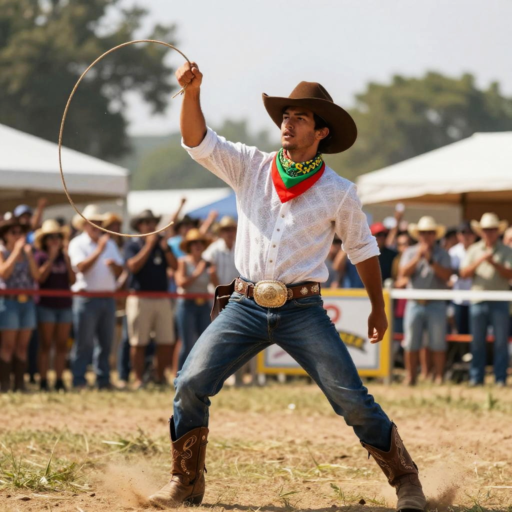 Flamboyant cowboy performing a dramatic lasso trick in a lively cowboy festival, colorful bandana, oversized belt buckle glinting in the sunlight, festive background with cheering crowd, hyper-realistic style