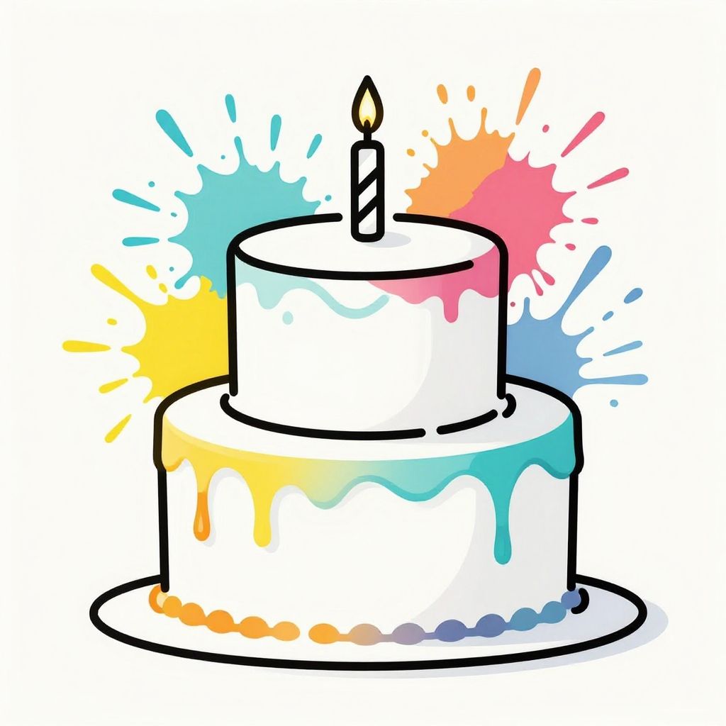 Artsy birthday images of minimalistic line art cakes with bright splashes of color, dynamic composition with paint splatters and drips, modern contemporary art feel