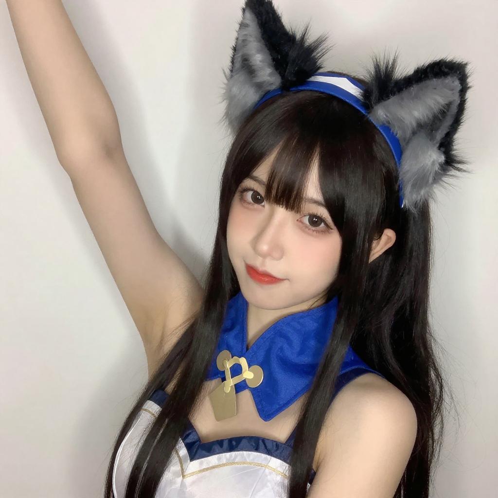 Photograph of a young woman with long, turquoise hair, wearing a white tank top with a pink butterfly design, and black lace trim. She has purple eyes, red lipstick, and a silver whisk on her head. Her right arm is raised, and she has teal cat ears with purple bows. She stands in a room with a wooden door in the background.