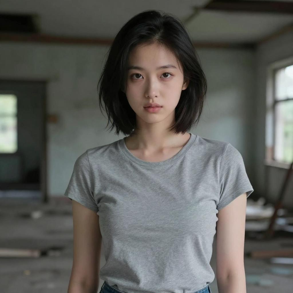 Young woman with long black hair, slightly out of focus, standing in a brightly lit modern airport terminal. She has a neutral expression. Background includes a long escalator, illuminated overhead lights, and blurred figures walking. Cool blue and white lighting.
