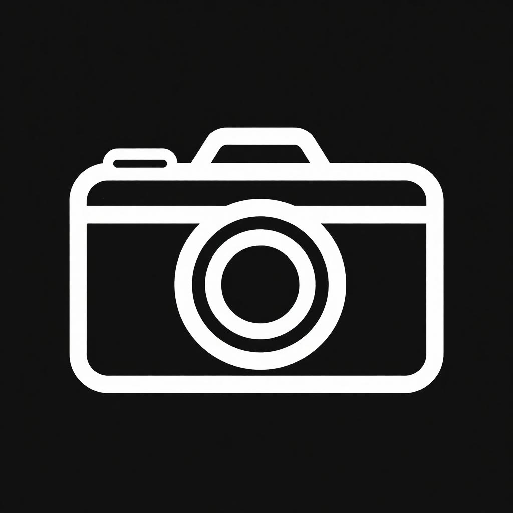 Digital white outline of a camera icon on a solid black background, featuring a circular lens and rectangular body.