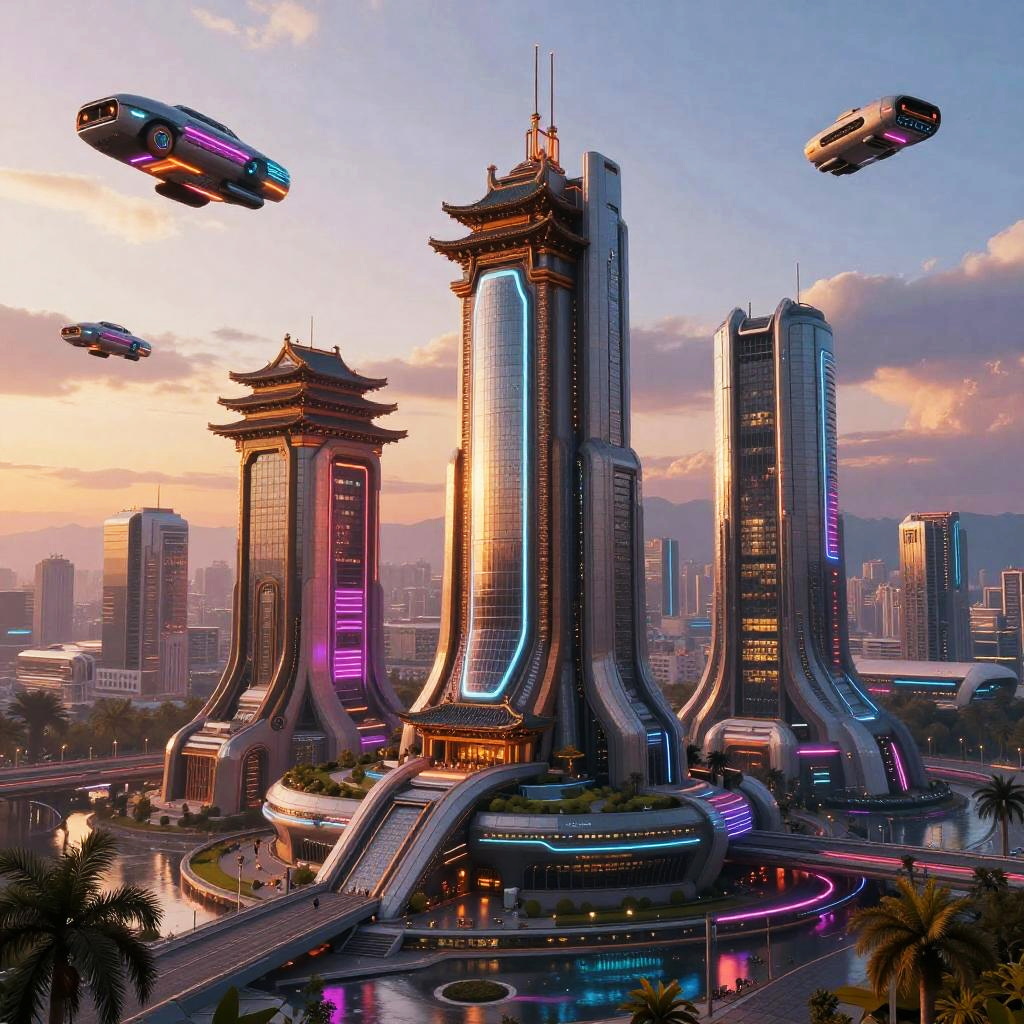 Zeitalter themed futuristic cityscape at sunset, blending ancient architecture with advanced technology, glowing neon lights reflecting on sleek surfaces, dynamic sky filled with flying vehicles, vibrant colors and detailed textures in high resolution.