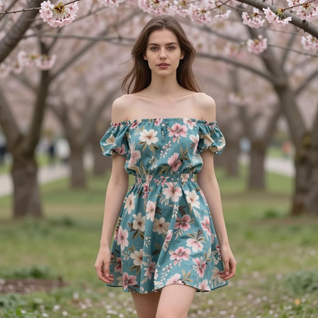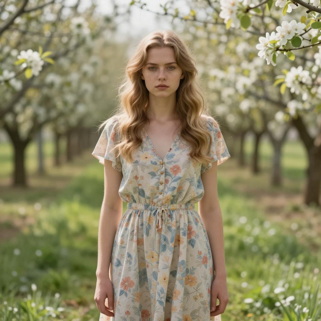 Chikankari dress, photorealistic portrait of young woman, standing outdoors, sunlight filtering through trees, white lace dress, pink flower bushes in background, soft focus, natural light, bohemian style, casual pose, brown hair in braid, subtle makeup, warm skin tone, delicate features, relaxed expression, springtime setting, mild shadow on right side