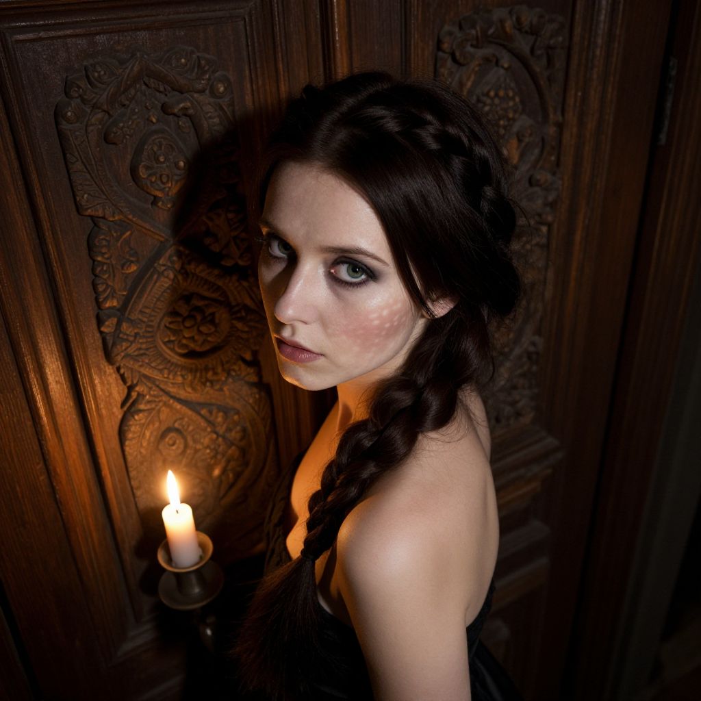 A photorealistic portrait, captured with a digital camera, reveals an enigmatic Eastern European woman adorned with porcelain skin, piercing green eyes, and long, dark chestnut hair elegantly braided down her back. Illuminated by the warm glow of a solitary candle in a dimly lit setting, she exudes a mysterious air—a blend of vulnerability and determination. The image captures her from a unique bird's-eye view perspective, showcasing the intricate interplay between light and shadow that casts an enchanting pattern across her face and shoulders. Standing before a weathered wooden door adorned with detailed carvings, this portrait evokes a sense of intrigue and longing for what awaits beyond.