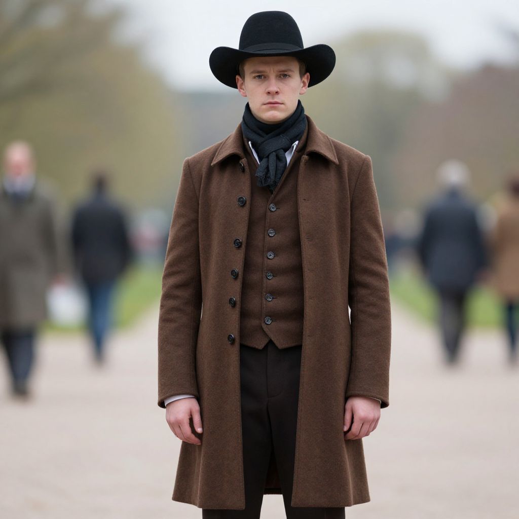 Female sherlock holmes, solo, hat, coat, male focus, blonde hair, 1boy, pants, boots, standing, shirt, full body, necktie, realistic, white shirt, collared shirt, black footwear, looking at viewer, vest, fedora, open coat, trench coat, long sleeves, black necktie, black coat