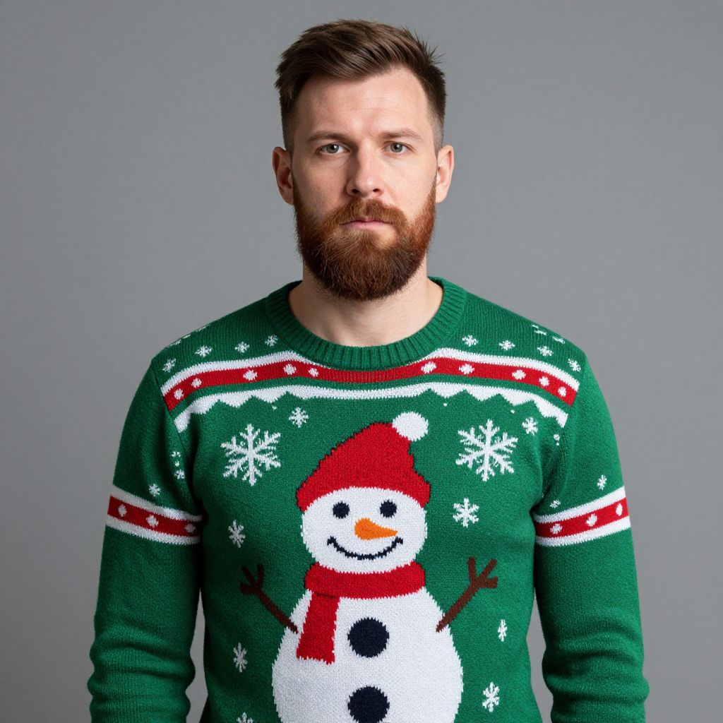 A man with a full, neatly trimmed beard and warm, friendly eyes is standing in front of a beautifully decorated Christmas tree adorned with twinkling lights, colorful ornaments, and a red bow at the top. He is wearing a cozy red and white sweater with a classic pattern of snowflakes, paired with black pants that have a subtle, slightly worn look. He is wearing a pair of red sneakers with white soles, giving him a festive and approachable appearance. He is looking directly at the camera with a smile, capturing a moment of holiday cheer and warmth in a cozy, well-lit living room setting. The background features soft winter lighting, snow gently falling outside the window, and the faint glow of the tree reflecting off the snowflakes on the ground.
