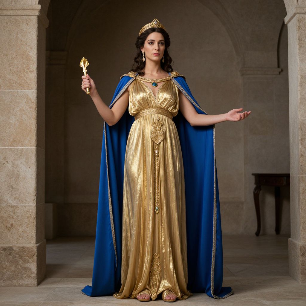 Photograph of a woman standing in a stone archway. She wears a golden, floor-length, Grecian-style dress with intricate patterns, a blue cape with gold trim, and a gold tiara. She holds a small golden scepter in her right hand and has her left hand outstretched. Her dark, wavy hair is loose. The background features beige stone walls and a small, dark wooden table. The lighting is soft, highlighting her regal attire. Her expression is calm and dignified.