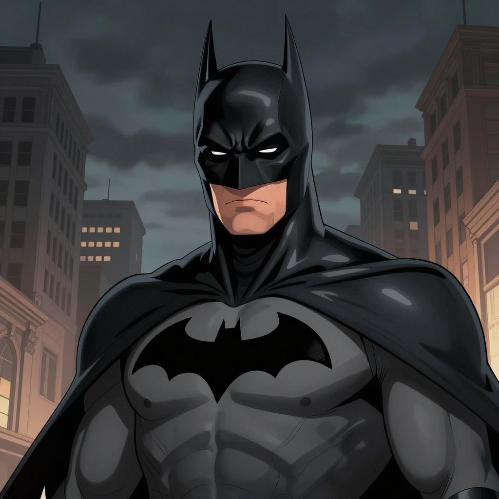 Illustration of Batman, a muscular man in a black, glossy batmask and suit with pointed ears. His face is partially visible, showing a serious expression. Dark, cloudy sky in the background with tall, gray buildings on either side. Batman's cowl and suit have a shiny ure. The background buildings have classical and modern architectural styles. The word "Batman" is visible on his chest.